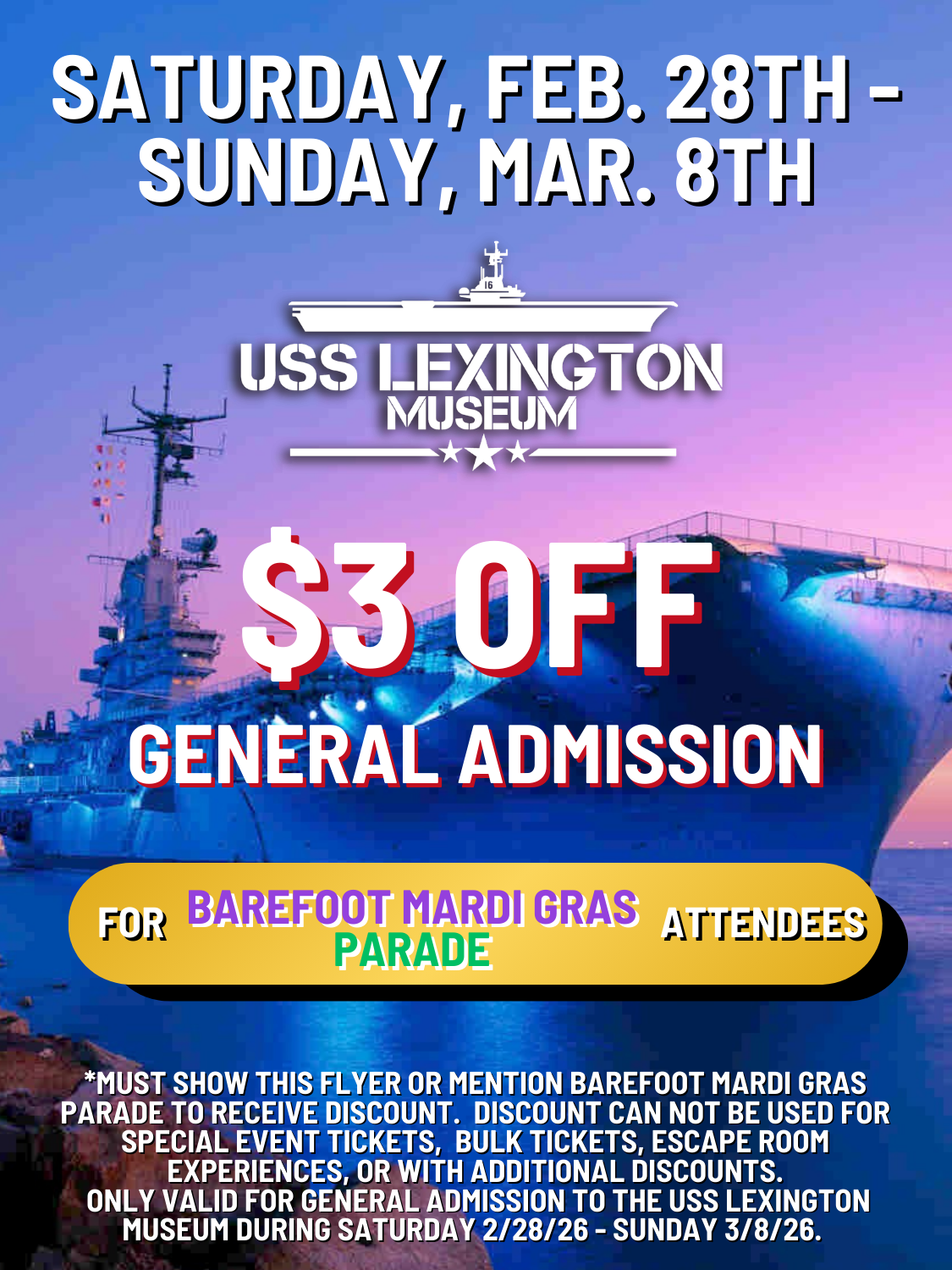 Only valid for general admission to the USS Lexington Museum during Saturday 2/28/26 – Sunday 3/8/26.